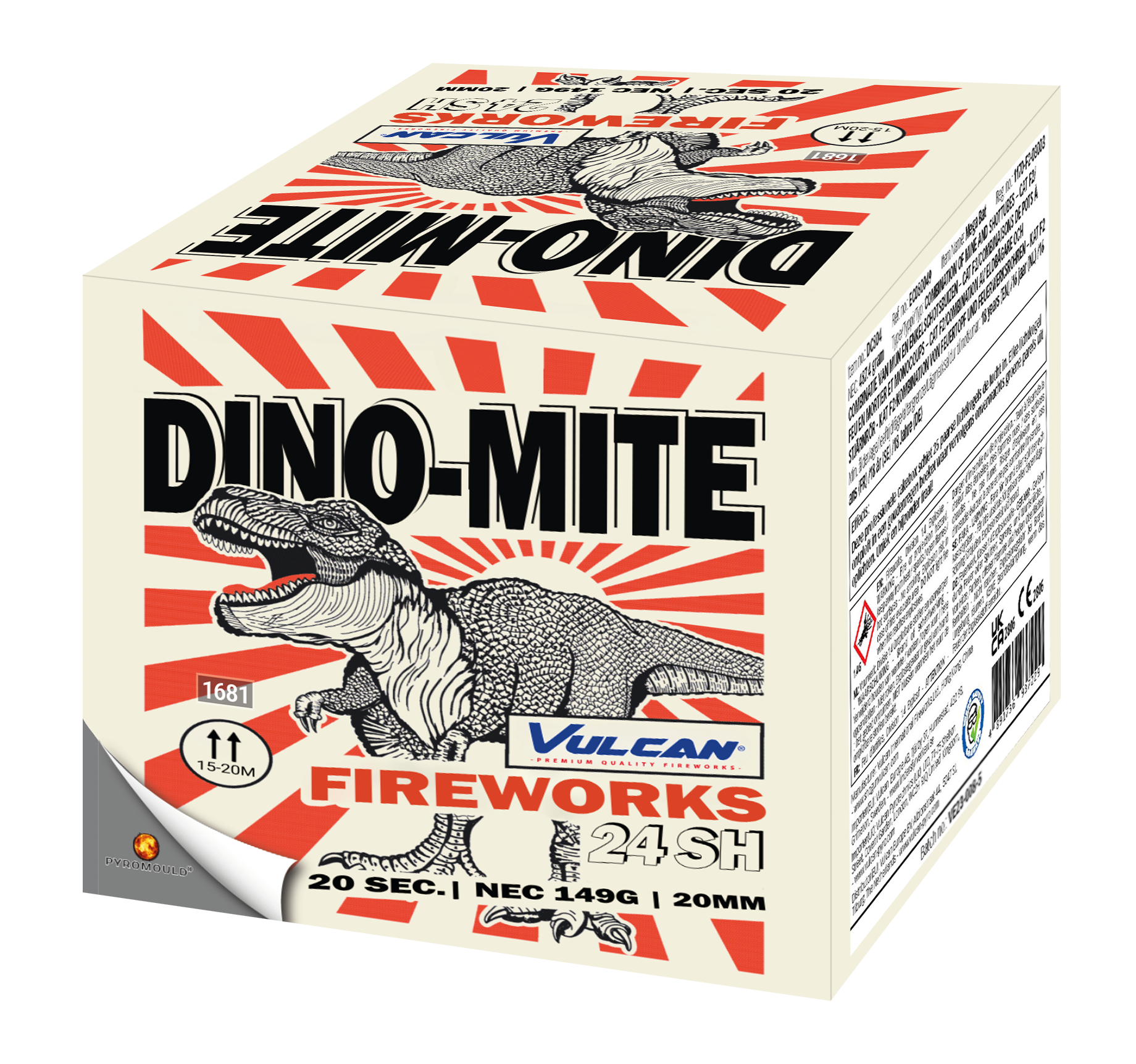 Deze Dino schiet gewoon lekker 24 schoten in de lucht die ontploffen in verschillende kleurboeketten.